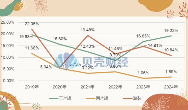 分产品来看,2019年,嘉美包装三片罐、两片罐、灌装的毛利率分别约为19.68%、11.68%、22.05%。到了2024年,其三片罐、两片罐、灌装的毛利率分别约为19.23%、1.59%、10.84%。