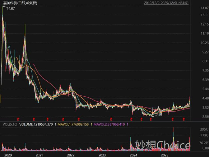 截至2025年12月9日收盘,嘉美包装当前股价为4.56元/股,公司总市值约43.57亿元,照此计算较其巅峰时期缩水约68%。